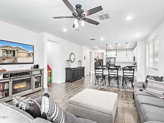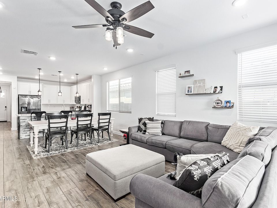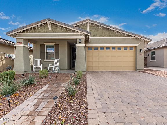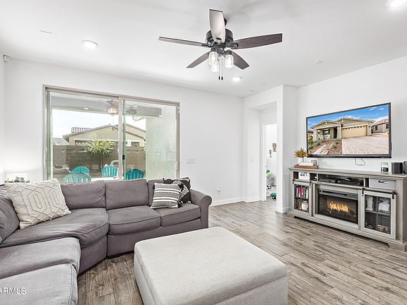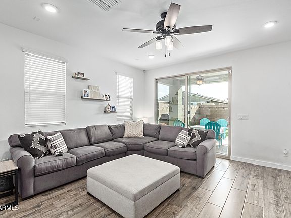 Nearly new home with recent upgrades! New carpet in 2022, extended tile wood plank flooring in primary bedroom, front bedroom and study. Board and batten wall in the front hall. Ship lap accent wall in the primary bedroom, stone work on the kitchen island, security screen door, storage racks in the garage plus turf & pavers added in backyard. Other features include den/office area that could be another bedroom, large walk in shower in primary bedroom, ceiling fans in several rooms, owned water softener & gas stub in the backyard. Washer/Dryer/Fridge all stay too! All this plus Verrado's community features such as 2 community pools, hiking, biking, tree lined streets, parks, restaurants, golf courses!