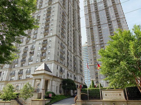 2 bd/2 ba 3rd floor unit at the Mayfair Tower in Midtown. Unit features an open living room and dining room area with a large glass slider leading to balcony overlooking manicured courtyard. Eat-in kitchen, and laundry room finish out the common space, both of which are hard to find in the city! Bedrooms are on either side of unit, perfect for a roommate situation. Each bedroom has its own private bath. Smaller bedroom has its own balcony with large glass slider. New kitchen appliances and full-size stackable washer/dryer remain with the unit. HVAC was replaced just over 1 year ago. Unit features hardwood floors throughout, expect kitchen, laundry room, and bathrooms which offer ceramic and porcelain tile. Building is one block from Piedmont Park and close to lots of shopping and attractions, including the Woodruff Arts Center. Unit comes with one deeded parking space, additional parking spaces for lease are available in the garage next door if needed. Building amenities include a gym, library, club room, formal garden with seating and two gas grills, and 24 hour concierge service. Guest parking is also available, which is hard to come by in the area. Monthly association fees include high-speed Internet, liability insurance, security, grounds maintenance, and trash collection (dumpster accessible via trash chute next to service elevator). Seller is an inactive licensed real estate agent.