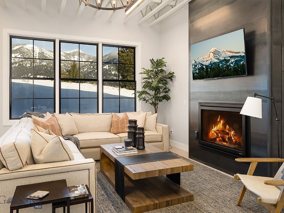 Seriously cool contemporary mountain vibe! Free standing tri plex, Moose Ridge Lofts are Designer furnished 4 bed, 4 1/2 bathroom beautifully designed in an incredible, highly sought after location. 1 indoor fireplace and 1 outdoor fireplace, chef's appointed kitchen appliances, AC and forced air heat system. Offered fully and beautifully furnished at asking price. Walking distance from Big Sky Town Center restaurants, shopping, farmers markets, live music and all that Big Sky has to offer. Open space behind the Moose Ridge Lofts ensures unobstructed mountain views. Enjoy rooms filled with natural light and breathtaking sunset Alpenglow over the mountain range. From the expansive 448 square foot deck with a propane fireplace, take in the spectacular views towards Yellowstone National Park. New construction, don't miss this opportunity to make a Moose Ridge Loft your home!