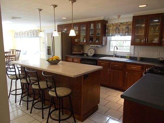 - Kit Dscrp: Pantry, Dining Area, Flooring - Stone/Ceramic Tile, Kitchen Island, Stainless Steel Appliances, Open Floor Plan, Recessed Lighting, Window(s) - Bay/Bow/Box, Gas Stove, Lighting - Pendant