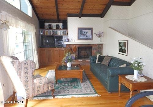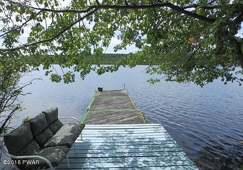 POST & BEAM LAKEFRONT ON 120 ACRE LAKEPost & Beam 2 Story on a level landscaped Lakefront parcel with prime Western exposure, features wood floors, living room with beamed cathedral ceilings, brick fireplace and lots of glass, updated kitchen with appliances and eating bar, bright dining room, glassed heated Pocono room, 4 bedrooms, 2 full baths, large family room with pellet stove, den/office, laundry with washer and dryer, great decks with lake views, 2 sheds, and landscaped walkway to a large private dock. Offered fully furnished.