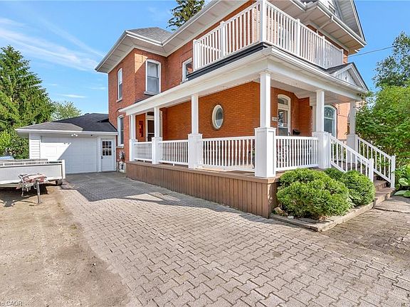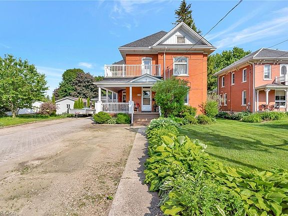 Welcome to 199 Ellen St, a charming century home overflowing with character located in the quiet family friendly town of Atwood, just a 45 min drive to Kitchener/Waterloo. This 5 bed, 2 bath, 2.5 story has beautiful curb appeal with an inviting wrap-around porch, solid red brick, lush landscaping, and a stone driveway to fit 6+ cars. Inside, the timeless appeal is seamlessly blended with modern upgrades from the elegant detail of the wood trim, some original stained glass windows and hardwood throughout to the classically renovated kitchen and bathrooms. The large entryway takes you to a cozy living room with large windows to let in plenty of natural light, and a gas fireplace where you will love to relax after a long day. From here you can separate the large formal dining room with traditional pocket doors. You will also find a den/office on this main level which is big enough to use to create a 6th bedroom on the main floor. Down the hall from the foyer is the gorgeous, modern-meets-rustic kitchen, with custom cream cabinetry and island, black granite countertops, gas stove and wood paneled ceiling, combining tradition and luxury. From here you can head through the mudroom where you'll find main floor laundry and a modern updated 3 pce bath. The oversized sliders will lead you to the peace and tranquility of the huge, treed backyard where you can enjoy the stunning gardens or relax on the private, well designed deck with a bar, or under the canopy where you can cool off under the fan. Store your toys and tools in the custom crafted shed. Upstairs there is an exquisitely designed electric fireplace with white shiplap, another fully updated 4 pce bathroom and 5 spacious bedrooms with one leading to your upper balcony, a great place to enjoy a morning coffee. If you're looking for more space or extra storage, there's a staircase to an attic with 500 sq feet to make your own. A perfect place to raise your children, close to community center/pool, schools and more!