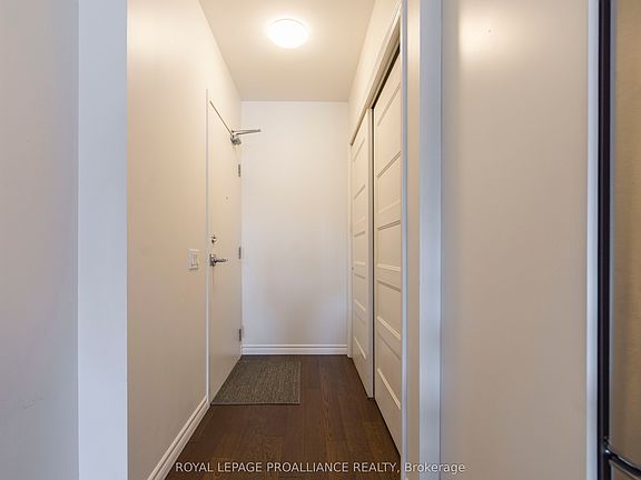 Welcome to Century Village in the heart of Belleville located just steps away from the city's best restaurants, boutiques and the Farmer's Market. This 1170 sq ft modern condo with high-end finishes, offers convenience, functionality and is accessibility friendly. The open concept living area offers a generous kitchen with an abundance of cupboards, crown moulding and gently used 6-year old quality stainless-steel appliances. A large centre island with a breakfast bar is ideal for meal preparation and entertaining. The bright living and dining area with Juliette Balcony offers east views and overlooks Belleville's desirable Old East Hill. This unit features a generous Primary Bedroom with a large closet, spacious en-suite with double sink and extra wide, tiled glass shower. (easy roll-in if needed) The den/bedroom with closet also accesses the 4 piece bathroom (cheater ensuite). The in-unit laundry and storage area completes the living space. Convenient designated heated underground parking is included and it is a short walk to Belleville's vibrant waterfront with walking and cycling trails, boat launches, and serviced marinas. This is an ideal location for a busy professional or retirement living.