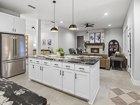 Inside, tall ceilings and natural light create an airy, open flow throughout. The living and dining spaces feature warm finishes and a beautiful stone fireplace that adds charm and character to the heart of the home. The kitchen ties it all together with a large island, clean lines, and thoughtful details—perfect for everyday living or entertaining.