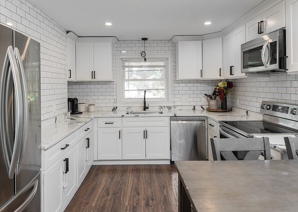 - Features: Flooring - Vinyl, Countertops - Upgraded, Breakfast Bar / Nook, Cabinets - Upgraded, Recessed Lighting, Lighting - Pendant, Crown Molding