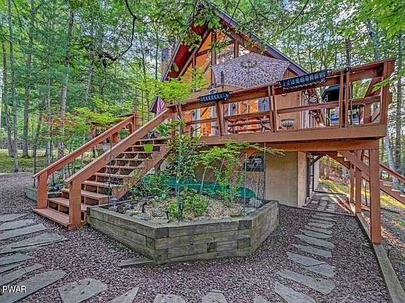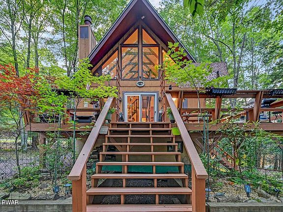 Nestled in the serene community of Tanglwood Lakes, this charming chalet offers a cozy retreat surrounded by nature. Step inside to discover the cathedral ceilings and skylights that flood the home with an abundance of natural light, creating a warm and inviting atmosphere. With 3 bedrooms, 2 bathrooms, and two bonus rooms, this property provides ample space for relaxation and entertainment. Cozy up by the wood-burning fireplace or enjoy the wood stove in the partially finished basement for additional warmth and ambiance. The loft area adds a great touch to the home, perfect for a home office or reading nook. Outside, a large deck overlooks the wooded lot, providing the perfect setting for al fresco dining or simply taking in the sights and sounds of nature. This home offers a tranquil escape from the hustle and bustle of everyday life. You're just a short distance from Tanglwood Lake where you can fish, canoe and kayak and a short golf cart ride to the private beach access on beautiful Lake Wallenpaupack.