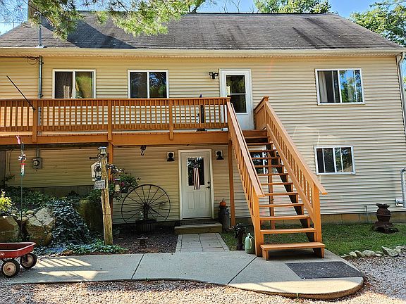 Welcome home! This unique, three-bedroom home features an open concept kitchen and living room perfect for holidays and entertaining. The loft-style second floor offers its own master bedroom and bathroom, while the basement offers a bonus living room. The partial wrap-around deck looks out to your very own private lot of over an acre and a half of tree-lined privacy. Experience what it's like to live on vacation all year long!