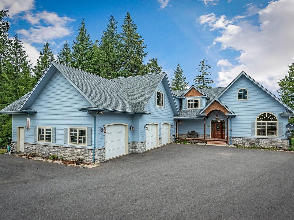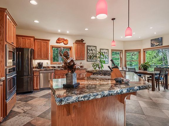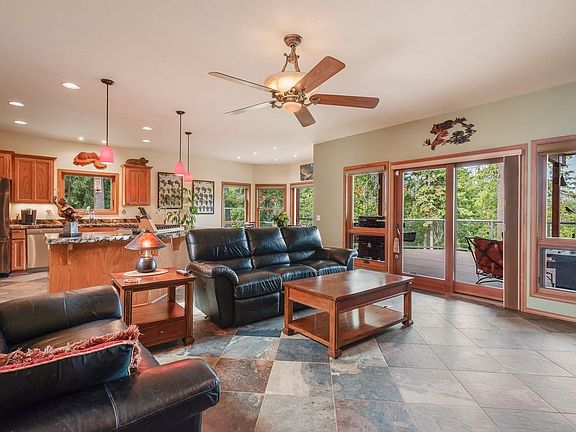 Fabulous private estate on 11.40 acres with wonderful mountain views This warm and inviting home is 3700 sf, and features natural stone floors with radiant heating, an open floor plan, a grand spacious custom kitchen and great room, wood insert with stone mantel, and a wall of windows to let the views and nature in. Open the sliders on to a big deck just made for entertaining or relax on the porch swing. The main level master suite features a fireplace, sitting room and spa like ensuite bath. A second main level bedroom is also ensuite. Upstairs you will find 2 nice sized bedrooms, one with a large office area, a full beautiful bath and a huge bonus room with fireplace, and bar area. In addition this custom home has an oversized 3 car garage, fenced yard, walking trails through the woods, and a great area that would be perfect for a shop.