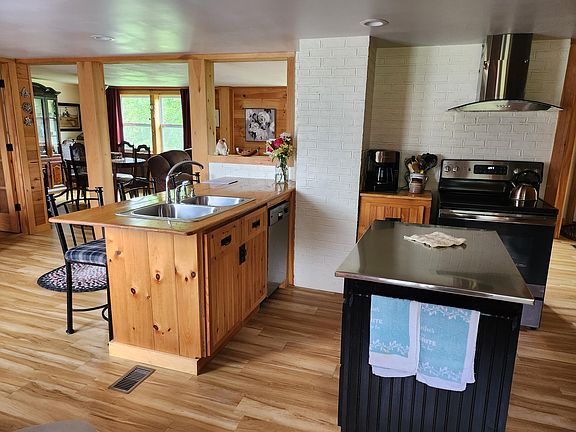 Beautiful ranch with 2 bedrooms, 1.5 baths, formal dining, spacious living room, kitchen with island countertops are white oak. Custom built cabinets, pantry. Laminate flooring thru-out. Pocket doors. Attached 2 car garage. Generac on demand generator. 2 sheds, fenced in yard for the dog. Beautiful landscaping with apple tree, pear tree, pond for the fish and ducks. many updates over the years such as wiring, insulated walls interior and exterior, oil tank water softener, garage and garage doors. All this located on 6.9 acres.