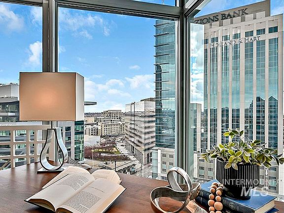A luxurious bird's eye view of downtown Boise in the prominent Tower Plaza Building! Absorb yourself in the city, living within arm's reach of restaurants, shops, breweries, and entertainment! This chic condo encourages a life paired down, ideal for executive stays or a low-maintenance primary residence for those who want to indulge in a lock-and-leave lifestyle. The efficient jewel box design distills the principles of modernism into a residence of radical simplicity. Every inch of it's floor plan has been maximized, thanks to the tall ceilings, a broad open floorplan, and walls of windows that connect the architecture to the city in a breathtaking fashion. Hunter Douglas® blinds and Lutron® ambient lighting system provide privacy or openness at your discretion, while highlighting the sophisticated finishes throughout.