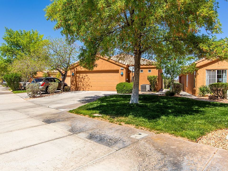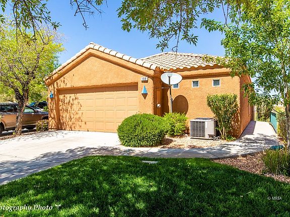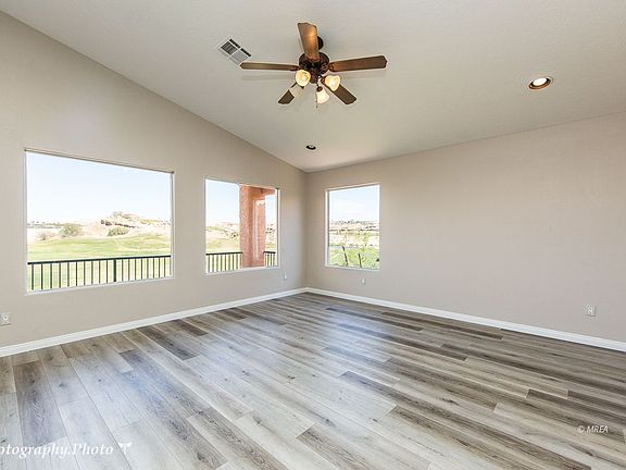 REMODELED / UPDATED April 2021. NEW LUXURY VINYL PLANK installed in entryway, hallways living room and dining area. Large "Picture Windows" surround the living room providing expansive views of the golf course driving range and mountains. Kitchen has a BRAND NEW SMOKED STAINLESS STEEL REFRIGERATOR, granite counters and rich colored cabinets. NEW PAINT THROUGHOUT the interior of this townhome. NEW CARPETING in all the bedrooms and downstairs family room. Main level has a large balcony just off the dining area that provides perfect outdoor enjoyment of the beautiful views. North facing backyard provides year round enjoyment when grilling outside and entertaining friends. Master Bedroom is spacious with a bathroom that has a soaking tub, shower and walk-in closet. Downstairs offers a unique floor plan that combines another bedroom and family room that was a walk out to a covered patio that looks directly onto the "Palmer Golf Course Driving Range". Exceptional location is just steps away from the Mesquite Vistas Sports Center that offers a pool, hot tub, pickleball courts, sand volleyball courts and workout facility.