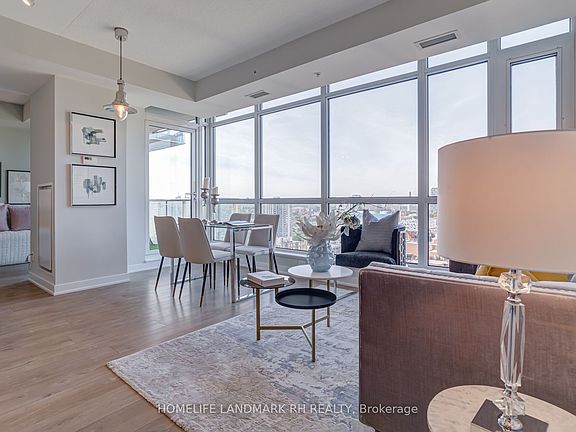 Unobstructed city viewFloor to ceiling windowsLaminate flooringOpen concept kitchenModern cabinetQuartz countertopBuilt-in appliances