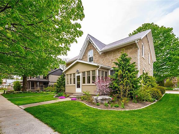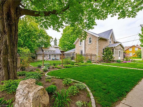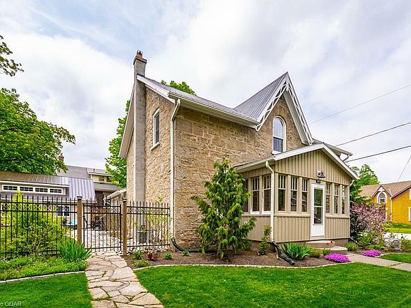 Welcome to a slice of history nestled within the enchanting town of Fergus, Ontario. Character, charm & pride of ownership resonate throughout this beautifully renovated 1878 century home with the perfect blend of old-world charm and contemporary living! As you step inside the welcoming front porch you will walk through the original hardwood front door to a main floor that boasts authentic locally harvested maple floors, soaring cathedral ceilings and lots of large windows with deep window sills to allow the natural sunlight to stream in. Also, on the main floor is a sizable kitchen with a center island, granite countertops and lots of storage space. You have a main floor bedroom, 3 piece bath and laundry room. The spacious living and dining room exhibit an exposed stone wall, a cozy fireplace and beautiful built in wall unit. Upstairs you will find 2 spacious bedrooms and a 4 piece bath featuring a soaker tub. Step outside to a yard framed with a stunning ornate fence a large stone patio and a beautiful perennial garden. The outdoor studio built in 2018 can be converted into a single garage. In 2023 it was finished as a partial studio/storage shed. It features a cozy wood stove and its versatility invites you to transform it into an office, cozy reading nook, art studio and more. There are boundless opportunities for personal expression within this remarkable space. Parking is a breeze with ample space for multiple vehicles. The 2016 renovations include, insulation, drywall, wiring, plumbing, windows, flooring, bathrooms and more. This remarkable property is just a short leisurely stroll from the grand river, schools, parks and the downtown core with plenty of shops and restaurants. Your dream home awaits! Book your showing today before its gone!