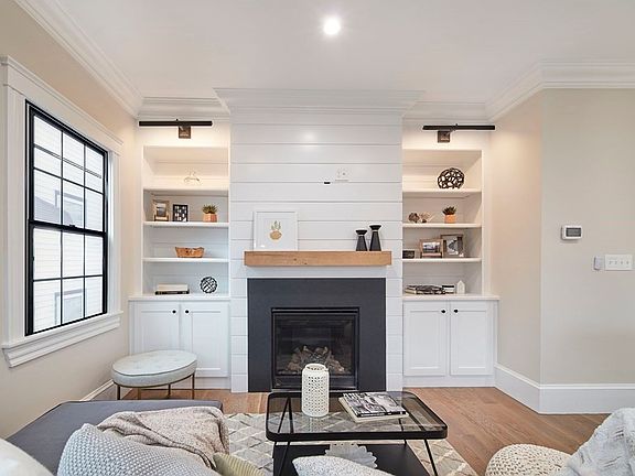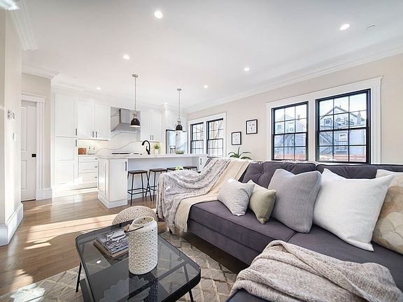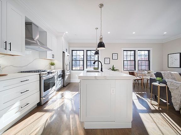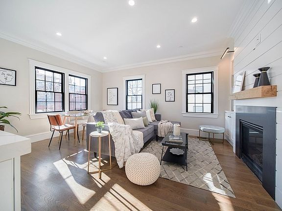Find your home in this sophisticated 2 bedroom duplex featuring off street parking, a lavish chef's kitchen, gas fireplace with custom built-ins & pet-friendly green space. Sunlight pours into the South facing open concept living area lined with 6 oversized windows, ornate crown moulding & millwork. Entertain from your 8.5 foot island, watch movies by the fire or host an intimate dinner for four in this welcoming space. A gorgeous kitchen is highlighted by 3" Statuario quartz countertop & full slab backsplash, GE Cafe Series appliance package & striking black accents. Both spacious bedrooms can accommodate king size beds & are nestled alongside a Statuario tiled bath with Mirabelle soaking tub, GROHE fixtures & separate laundry room. LED downlighting & solid white oak flooring throughout, Central HVAC via Hibersense, 27" Electrolux washer & dryer, Ring doorbell & keyless entry. Walk to the Blue Line, dining, parks, the Greenway & Constitution Beach from this charming tree lined block!