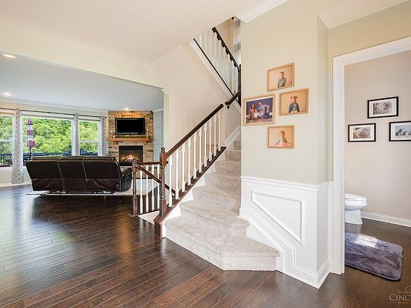 Beautiful 4 bedroom home in a quiet, kid friendly neighborhood complete with walking trails and stocked ponds for fishing! Perfectly located only 1.5 miles from Downtown Loveland and the Loveland Bike Trail! First floor offers hand scraped hardwood flooring, wainscoting in entryway, timeless crown molding, stone gas fireplace, mud room, and office space off the kitchen! Newer carpet on 2nd floor! Partially finished walkout basement with framed in bathroom ready for your own personal touch! Custom 3 Car Garage with epoxy flooring and loads of extra storage! Enjoy the large deck and overlook the private tree lined, fenced backyard! Playset and swing on deck convey with the property!