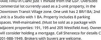 RARE FIND in Clark! Just 1 minute from the GSP. Oversized commercial lot currently used as a 2-unit property, in the Downtown Transit Village zone. One unit has 2 BR/1BA; 2nd Unit is a Studio with 1 BA. Property includes 8 parking spaces. Well-maintained. (Must be sold as a package with adjacent properties: 191, 195 and 205 Westfield Ave). Owner will consider holding a mortgage. Call Sheneeza for details C: 201-988-1949. Brokers with buyers are welcome.