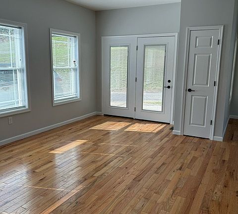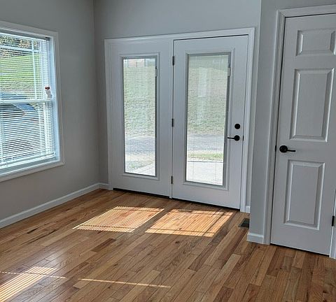 Upper level duplex with own entrance. Lots of windows. One car garage (16'x24'). Covered porch. All one level. Two bedrooms. Two bathrooms. Washer and dryer in unit. Kitchen appliances include stove, refrigerator, microwave, dishwasher. Laminate flooring. Carpet in bedrooms. Rent includes garbage removal. No pets. No smoking inside. Owner pays for trash removal. Renter is responsible for water, sewage and electric. Security deposit and prorate first month rent is due at lease signing. Twelve-month lease required. No smoking inside. No pets.