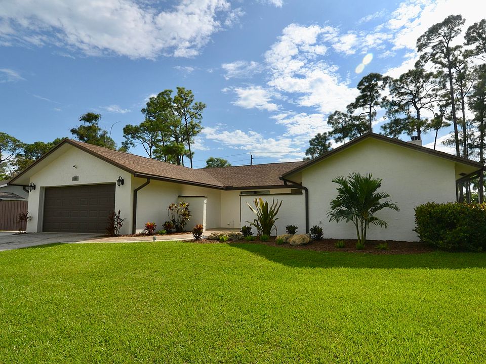 Magnificent and beautifully updated home nestled on a huge park like .59 acre lot. Kitchen with SS appliances, granite countertops and backsplash. custom cabinets with eat in kitchen and breakfast bar. Formal Dining room, large living room with wood burning fireplace. Huge owner suite with walking closet and storage closet. Split bedroom plan, screening patio, hurricane impact windows and sliders, huge backyard with well sprinklers, roof replaced in 2015. No HOA, oversize two garage. Home has been completely redone. Storage shed. Easy to show.