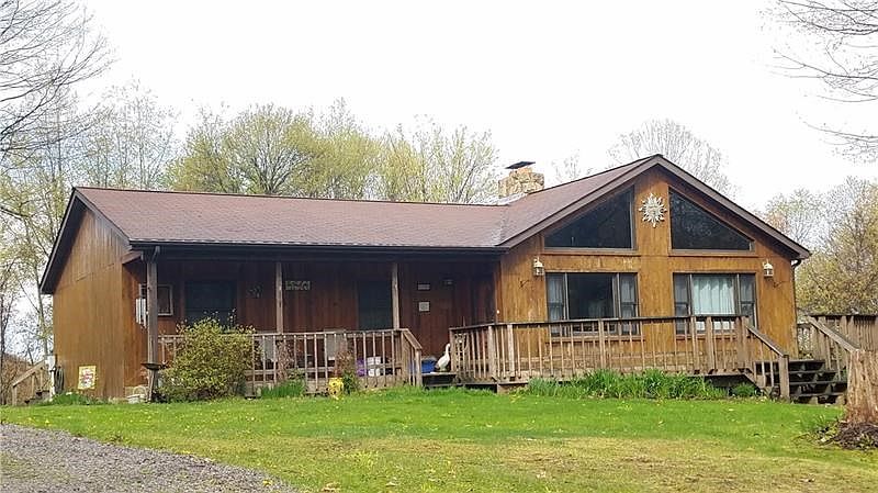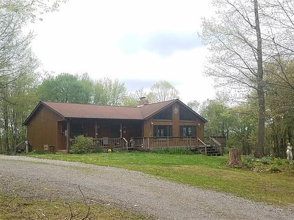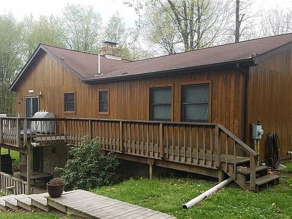 Country roads take you home to this Cedar Ranch. Living room offers beautiful Stone fireplace, Bamboo floors, Cathedral ceilings. Kitchen features oak cabinets and recessed lighting and door to the wrap around deck. You'll find a second kitchen on the lower level with a wood burner in lower level. The oversize heated garage has its own electrical system. All this on 2.62 acres with fruit trees and berry bushes and the property abuts the game lands makes this property very secluded and private.
