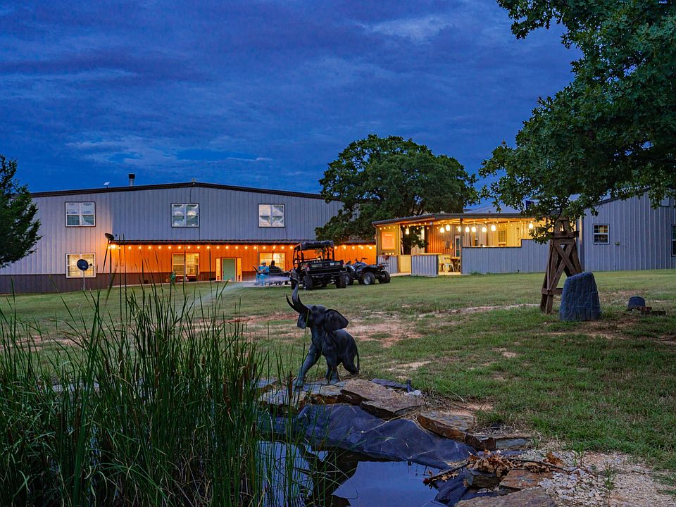 Looking for a private slice of paradise? Experience unparalleled luxury and versatility at this gated, one of a kind 35 acre ranch backing to a serene 6 acre lake where you can escape the city to unwind or entertain on a grand scale. Here you will step into a world where rustic charm meets modern sophistication, and there is something for everyone. Whether you like to hunt, fish, shoot skeet or target practice, ride horses or ATV’s, you can enjoy the great outdoors in style. The crown jewel of this estate is the expansive approx 6,300 sq ft main residence, a masterpiece of craftsmanship and design. Featuring 3 spacious bedrooms, easily convertible to 5, the primary suite is 1250 sqft, the home is adorned with unique touches such as rustic tin ceilings, industrial Harley Davidson lighting, and 100+ year-old reclaimed wood, blending timeless elegance with rugged allure. Gather together in the 1500 sf main living area, a huge dining and double island epicurean kitchen for holidays and reunions. The stage is already set for culinary creations with top-of-the-line Viking appliances. Adjacent to the main house, approx 1,400 sqft guest house perfect for visitors or extended family. These two homes share an oversized outdoor commercial cooking and dining area. This estate also boasts an impressive 10,500 sqft of shop space under a class 4 commercial roof, perfect for car enthusiasts, artisans, or entrepreneurs. With 7 stalls, RV and boat storage, 2 wells, and state-of-the-art 74 solar panels, the property is as functional as it is beautiful. This property isn't just a home; it's an opportunity designed to inspire and impress with rare combination of natural beauty and architectural excellence. With its vast acreage, several hunting blinds, numerous amenities, it’s ideal for a family retreat, a working ranch, or an income-generating venue. Here, the possibilities are as endless as the stunning sunsets.