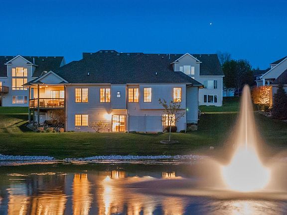 Special touches highlight this immaculate walkout ranch, over 2,800 sq. ft. of finished area, backing to a private lake with awe-inspiring views. Hardwood floors accentuate the front entry, hallway and other traffic areas. A spacious kitchen features oak cabinetry, granite counters, stainless steel appliances and an eating area. A laundry room with sink is off the garage corridor. The kitchen opens to a formal dining area views of the pond. An elaborate coffered ceiling with illuminating indirect lighting spotlights the great room. This area offers a fireplace and an abundance of windows, again with spectacular view of the private lake and its surroundings. The master bedroom has a walk-in closet and bath with a whirlpool and shower. Two nicely sized bedrooms and a full guest bath complete the main level. The finished basement features two bedrooms, family room with fireplace and full bath. Extras include tile flooring in the kitchen and baths, a covered deck and irrigation.