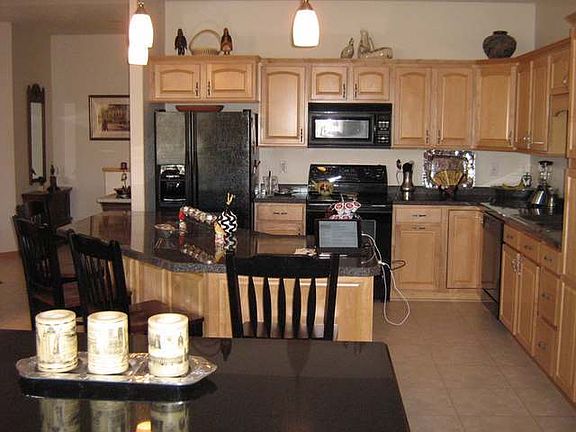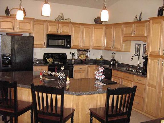 Beautiful move in ready ranch style twin home in NW Bismarck with incredible views. Open floor plan with kitchen, dining and living room. Maple cabinets & woodwork. Covered deck with access from living room and master bedroom. Main floor master bedroom with large master bath including whirlpool tub, separate shower and double sinks. Large walk in closet. There is also a guest bedroom, full bath and large laundry room on the main level. Downstairs you will find a large family room with walk out to the covered patio and natural gas fireplace. 2 additional large bedrooms (1 with walk in closet) and full bath. Plus a wet bar with fridge. A large storage room completes the lower level. Surround sound. The triple garage is finished with heat, drain and water. Private back yard to enjoy the views from your deck. Additional items included are the wine rack, display bookcase in lower level, wood shelving, white cabinets & most of the steel shelving in store room & workbench in garage.