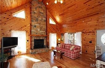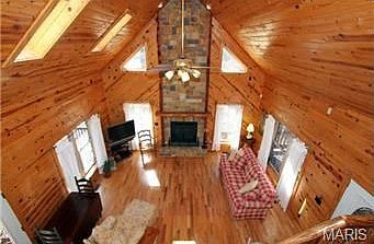 Short Sale opportunity in great condition! Custom built log home on a secluded lake community setting. The feel of the Smoky Mountains yet just minutes from Wildwood. This 1.5 story plan offers a soaring vaulted Great Room highlighted with a gas fireplace, floor to ceiling stone front with carved wood mantel and raised hearth. Main floor master bedroom & tiled bathroom. The kitchen features custom Hickory cabinets with slide out shelving & some glass doors, granite countertops & center island with an additional sink. Off the kitchen you have the convenience of the main floor laundry. Exposed wood steps leads to the upper level balcony, 2 spacious bedrooms both with vaulted ceilings, wood floors & 2nd full bath. The walk out lower level is unfinished & ready for your personal touches. Unwind on the large rear deck backing to an open field and enjoy both the water fall and Koi pond. 2 utility sheds provide additonal storage along with the oversized garage and circle driveway.