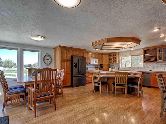Welcome to this thoughtfully maintained home, centrally located on an acre lot in Burley, including 1 water share. The spacious kitchen is equipped with black stainless Bosch appliances, double ovens, and a large island, perfect for cooking and entertaining. The main living room provides ample space, while the daylight basement offers a second living area, a third bedroom, a full bathroom with a new shower surround, and a storage room ready for a potential kitchen addition with nearby plumbing and electrical. The 3-car garage is insulated, heated, and finished with epoxy flooring, a dream. An electric awning extends over the side patio for convenient shade. Recent updates include new plumbing throughout (2024), 75% new electrical (2023), and added insulation in the roof and exterior walls for energy efficiency. Step outside to enjoy sweeping views of the mountains and countryside. The property also features a full automatic sprinkler system and power to all outbuildings, providing both space and functionality