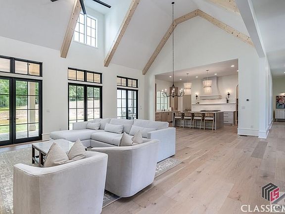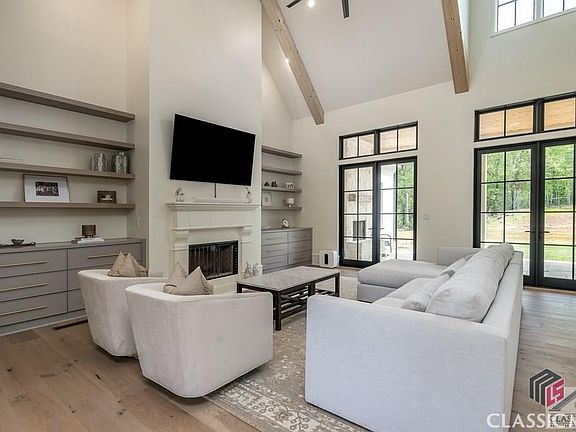 Stunning custom Estate home only 1 year young, located in the nationally acclaimed North Oconee School District on 2 acres in the premier gated community of River's Edge. Enter through the custom iron front door to the foyer that is flanked by a study and dining room that seats 8+. The living room has a beautiful vaulted ceiling with wood beams, built-ins and a cast surround custom fireplace. The living room leads to the covered back porch with fireplace and walkout back yard, that would easily accommodate a pool. Open to the living room is a spectacular chef's kitchen that is surround by a large center island, custom window over the sink that looks out into the back yard, custom white oak cabinets with soft-close feature, 48 in Wolf Range with double oven, SubZero French Door Fridge/Freezer, Bosch Dishwasher, Sharp Microwave Drawer, Quartzite counter tops, walk-in butler's pantry with beverage fridge. Off of the kitchen is the powder bath, mudroom and access to the 3 car garage. The main level master suite has a vaulted ceiling, bathroom with separate vessel tub, marble flooring, 2 large walk-in closets. White oak flooring, two staircases with iron railing, designer lighting, plumbing fixtures, and wallpaper throughout. There is an additional bedroom and full bathroom on the main level. Upstairs are four bedrooms, a common room for flex space and a small craft room. There is also a large unfinished room above the garage that would make a great home gym or office. Marvin windows and doors, frameless shower doors, spray foam insulation (the home is very energy efficient). The basement already has a separate heating and air system, plumbing rough in, and electrical. A complete list of the many features and finishes are available upon request. Great opportunity to avoid the construction process and own an almost new home in one of the top school districts in America! Convenient to major access roads, Athens and Atlanta.