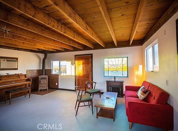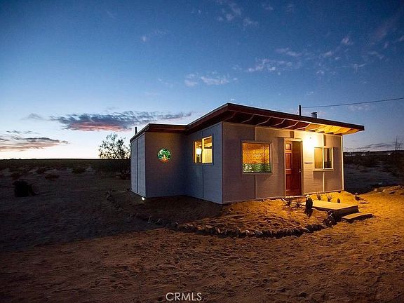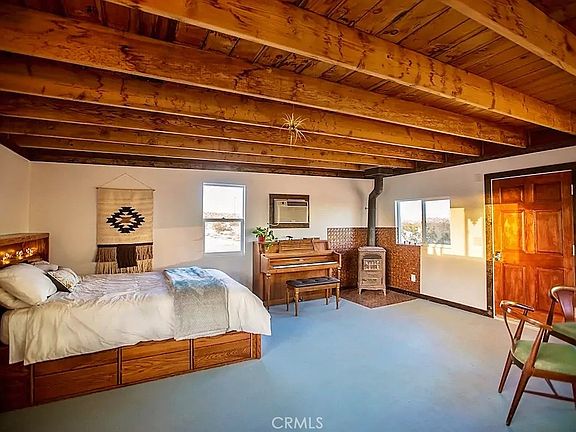 This place is booked year round! Successful 5-star Airbnb! Here's your chance to own a beautiful, 1 bathroom open concept cabin on 2.5 acres. Located halfway between BOTH entrances to Joshua Tree National Park, in the sought-out neighborhood of Desert Heights! Originally a rec. cabin, the current owners have undergone the costly and lengthy process and have been granted short term rental permit with SFR designation. The 1 room cabin has open interior with gorgeous exposed wood beam ceilings and features both a wood stove and an a/c unit for climate control. A tidy kitchenette area features tile counters, a mini-fridge and cooktop for essential cooking needs. The bathroom has been luxuriously appointed with floor to ceiling tile, a huge walk-in rain shower and sleek vanity. With desert views all around, guests love to relax under the stars, make smores around the fire pit, and unplug in the serenity of the quiet landscape. This very special property is a great turn-key opportunity!