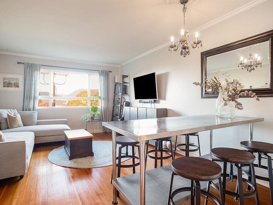 2 LEVEL PENTHOUSE W/ ROOFTOP & VIEWS. Welcome home to Mapleview Place in the heart of Kits; steps to the Arbutus greenway, Kits beach, the best restaurants & shops, & the new Arbutus Broadway Station. The minute you step inside you will be blown away by the stunning city and mountain views. Over 730 sqft of functional living space in this oversized north facing one bed + flex home. You'll love the reclaimed floors, custom barn door & open concept kitchen w/ breakfast bar, perfect for casual meals in. Upstairs enjoy your large primary suite w/ room for a king sized bed, updated bathroom w/ soaker tub & glass surround, & access to your south facing rooftop patio with views of downtown & the North Shore Mountains. 1 parking & pets/rentals allowed. Our pleasure to show!