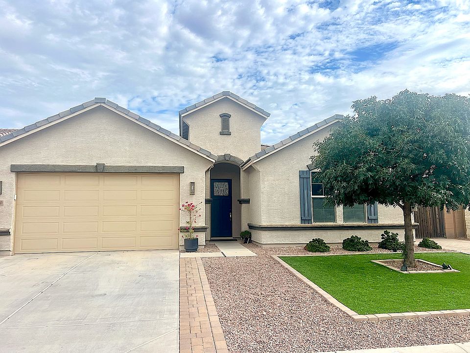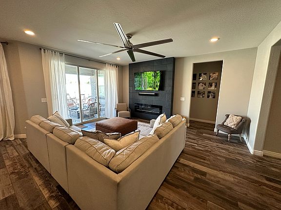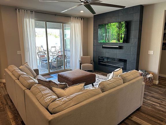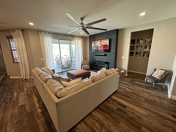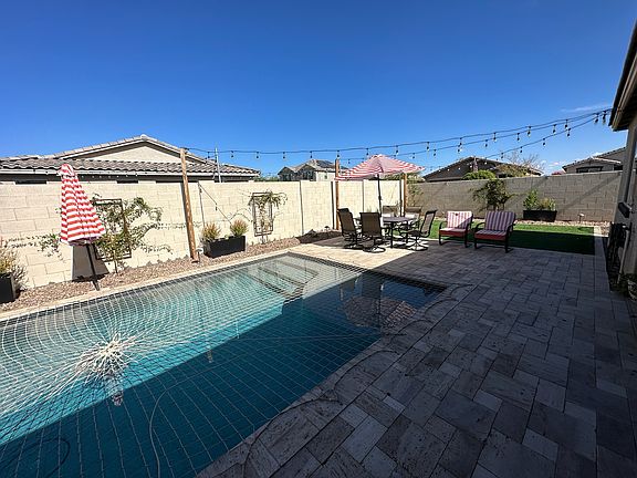 Stunning single-story home with nearly 2,600 square feet of living space, featuring 9-foot ceilings, 4 spacious bedrooms (every room has a walk in closet), 2.5 bathrooms, and a cozy den with stylish sliding barn doors. The open-concept great room includes a modern kitchen with a pantry, a dining area, and a fireplace wall showcasing an electric fireplace, custom tile, and inset TV with Sonos sound. The beautifully designed backyard offers low-maintenance turf, a drip irrigation system on a timer, landscape lighting that illuminates the yard at night, and a gorgeous pool surrounded by travertine hardscapes perfect for outdoor relaxation and entertaining. The master suite boasts a large walk-in closet, a separate soaking tub, and a walk-in shower. Additional features include double gates with space to store trailers or vehicles, within HOA height restrictions (we were able to store a flatbed trailer AND a non-lifted truck in the side yard with no issues), a 3 car garage, and access to fiber (900+ mbps) internet speeds. The pool has a catch-a-kid net over the top, or a removable fence that goes around it. Our current tenants, who have been wonderful, are moving into their newly built home, and we're now searching for the next family to enjoy this lovely space. Price is based on a current 1 year lease with some select furnished items/decor, rack networking and smart systems, and other various details. Price of new lease will be based on length of lease, furnishings, pets/no pets, etc. Willing to do short term lease as little as 3 months for slightly higher monthly/lease terms. Owner pays for pool maintenance, HOA monthly, and Fiber Internet. Tenant pays for all other utilities and continued care for the home according to the HOA standards. We had wonderful tenants for the past year, and are looking to continue that trend with the next family.