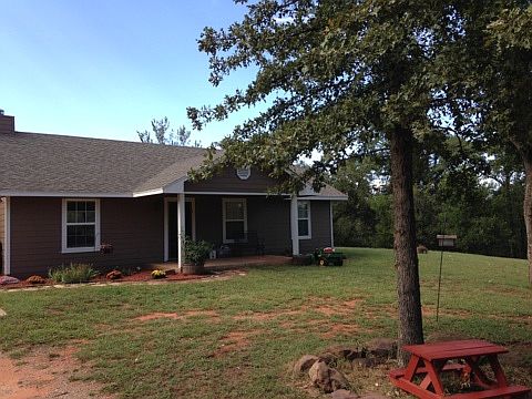 Beautiful wooded acreage with 2004 built home. Huge kitchen is open to the living room. Rolling terrain with large Post Oaks. 2 car garage door but only fits one car and has work bench space. Paved road with great highway access. Unfinished storage building. Attic fan. Covered front porch. Very private. This home can go VA, FHA, or conventional loan.