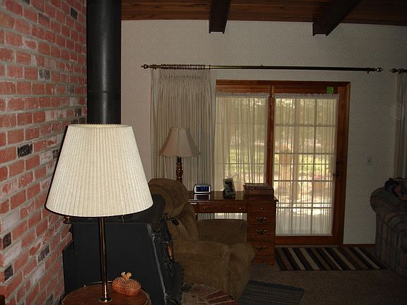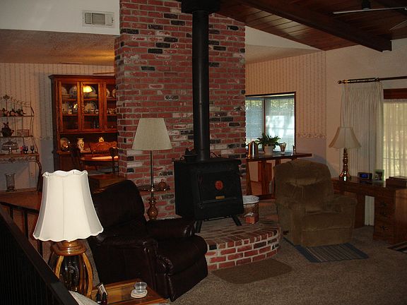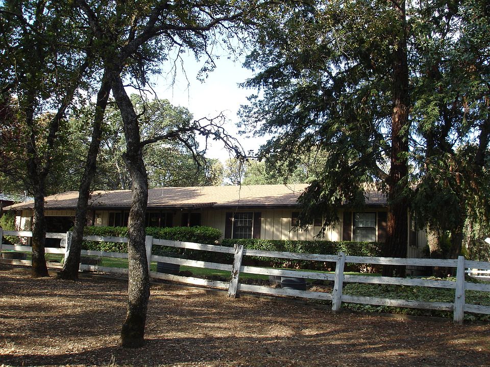 Welcome to this comfortable home in good condition sitting on 11 acres up off the road located in a very private setting with lots of oak trees. There are outbuildings used for storage right now. Property is completely fenced with a round pen. Gated entry with gravel road to concrete driveway. Property does extend up the road and past the gate on the right. Roof is approximately 4 years old. Air conditioning unit is approximately 5-7 years old. There is a sprinkler system. The garage is sheet-rocked, has a garage door opener, lots of storage and has a bathroom. The laundry room is located off the kitchen. From the kitchen, there is a step down to the living room with vaulted ceilings and a wood burning stove. There is a separate dining room for entertaining. Ceiling fans in the bedrooms, and living room.