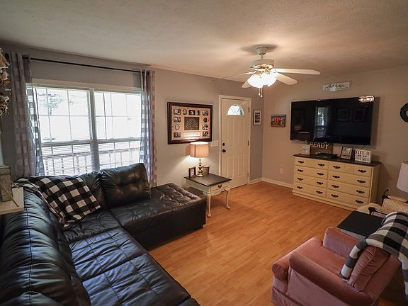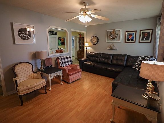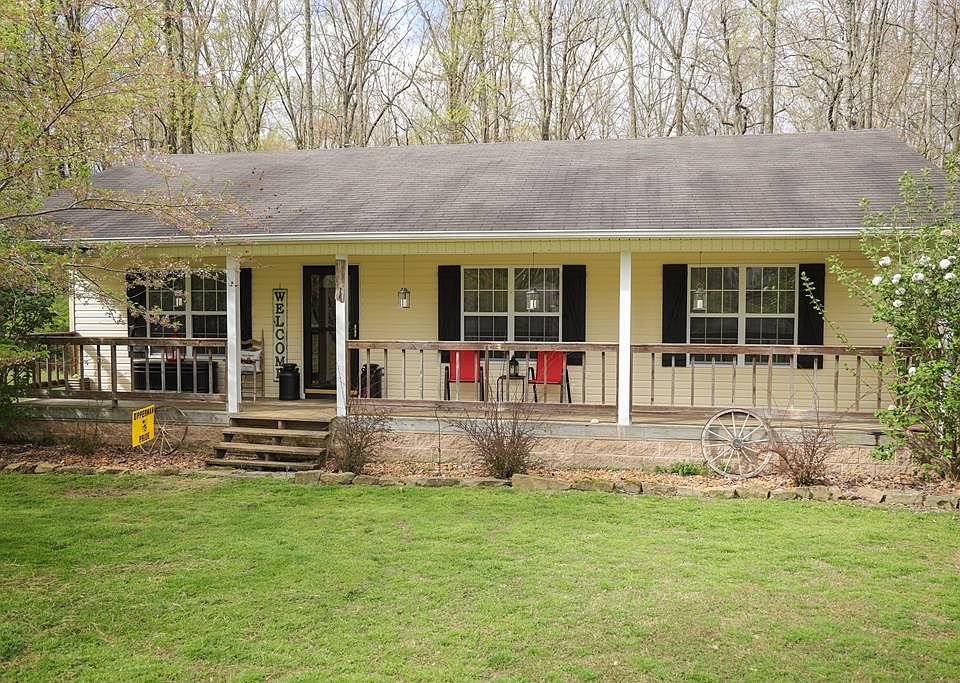 Enjoy rocking on your covered front porch! This one level home offers affordable living with convenient location. Home features 3 bedrooms, 2 baths with split bedroom plan. Neutral grey family room and sunny kitchen make for enjoyable family time. Level, 200 x 157 yard that backs up to woods for privacy, outbuilding, and above ground pool. Home is located just outside the city limits -- convenient without city taxes. This home wont last long!