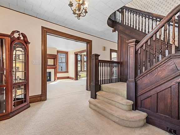 This beautiful three-story Victorian frame house features classic woodwork, moldings, and bay windows with window seats that are representative of the original design of the era. Inside, the house is adorned with an entry fireplace, and an ornate staircase that adds to the historic charm of the property. The second floor boasts an open hallway that includes a sitting area with a fireplace and a curved balcony that overlooks a stunning large stained glass window, creating a perfect spot to relax and take in the beauty of the surrounding. All this plus room to roam with a full third floor with 4 rooms. New roof, new central air, plus a double level lot, one car garage with additional driveway parking, large covered front and rear porch. concrete patio with a large yard is perfect for entertaining. The interior turns back time with so many original features. This home has been lovingly maintained. Original pantry off of the kitchen with an entry into the dining room also.