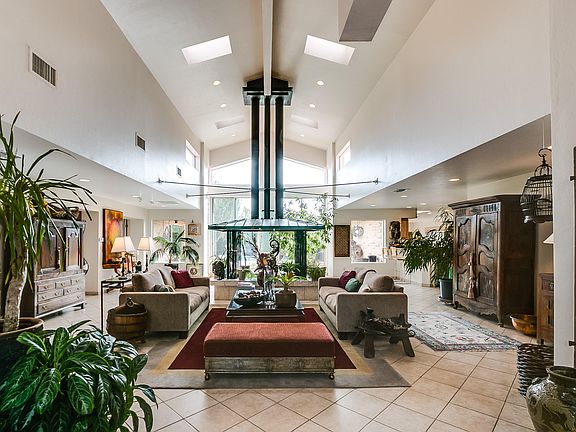 This is a one-of-a-kind gem on 2.56 acres in the heart of Green Valley. Totally remodeled from its 1973 plan and architecturally re-designed, this home is a stunner! With 23 ft ceilings in the living room and floor to ceiling fountain, recessed lighting, tall windows and a center wood-burning fireplace similar to one in a top resort in California, you'll be excited to call this home yours! There are 2 large suites plus an office/3rd bedroom. The huge master suite has lots of natural light from the windows that overlook the back patio and pool. The deluxe master bath features glass block walls, large ceramic tile floor, jetted tub, separate walk-in shower and marble counters on natural maple cabinets. The other suite is also huge and has a luxury bath with glass block walk-in shower, marble countertops and tile floor. There's also a large walk-in closet. The 3rd bedroom/office is designed as dual purpose. You can work at the built-in desk with a granite slab top and plenty of cabinets for your papers or turn it into a guest bedroom with an adjacent bathroom with shower. The kitchen area is designed for entertaining and comfort with large granite top island, eat-in area, and seating area with TV, maple cabinets and lots of windows that bring the outdoors in. From here you can walk outside to the patio and pool with a large stone waterfall giving your space the feel of tranquility and peace, an oasis in the desert! A separate open formal dining room with beamed ceiling, original adobe wall, large ceramic tile on the diagonal, and recessed lighting is there for your entertaining needs.