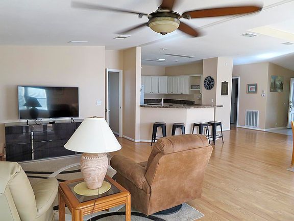 TWO Bedrooms, TWO Baths plus office/den with laminate floors. Open floor plan makes entertaining easy. Big kitchen with tons of cupboards and pantry. Cathedral ceilings, trayed ceiling in formal dining room and primary suite. Large master bath with dual sinks. Extra wide drive. Fenced yard for the furr-babies. 2022 ROOF. 2018 HVAC. FURNISHED.