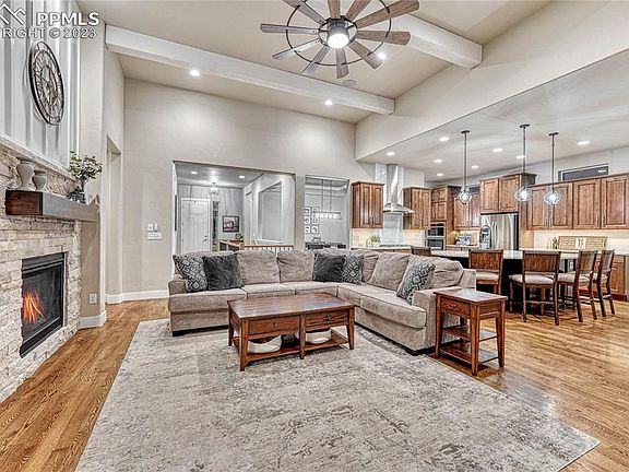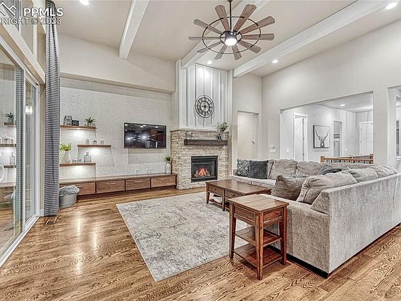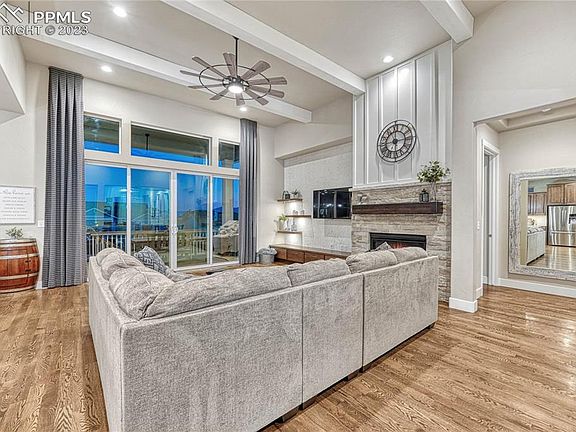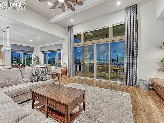 Elegant and one of a kind interior designed High end finished Award winning Vantage Model Home. Glowing with pride in ownership, this pristine Walk out Ranch home is move in ready. Coming through the Massive windows, you will enjoy the Flow of Natural light as it fills the high ceiling great room and glistens off the Hardwood floors. This open concept has an impressive dream gourmet kitchen with double ovens, Large gas cook top with overhead vent and walk in pantry, over sided granite Island w/breakfast bar and an abundance of surrounding granite counters and cabinets. The kitchen has an eat in area for a large dining area. Great for entertaining! Use the separate dining room for a more formal experience. The great room, that walks out to the Back Covered deck, has Colorado Style. Beamed ceilings and a stacked stone fireplace with custom designed shelving. The Relaxing Primary en-suite has ample wall space for dressers and a private walk out to the back Deck. The En-suite has a large custom walk in shower and pass through into a massive his and hers closet and a Laundry room with a sink, cabinets and country storage bench. The 2nd En-Suite has a separate sitting/office area with a sliding glass door walk out and attached private bath. The Expansive Walk out basement is just as beautiful with a custom fireplace, designer wall with shelving and a Wet bar. Guest will love the 2 oversized bedrooms and full bathroom and an additional Jr. En-suite with bathroom. Tucked away in a corner and enclosed with a barn doors is a flex room great for an exercise room. Step out to the gorgeous outdoors in the Colorado sunshine and Views. Enjoy a BBQ with friends and family or grab a glass of wine and sit under the starry night sky. All is located in the most Outstanding Flying Horse with a Magnificent Country Club, Golf Course Gym with Pickle Ball courts. swimming pool, exercise area, Spa, Clay tennis courts, Hotel and so much more at extra fee. Living Wonderful Colorado Life Style!
