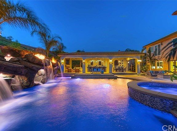 Unquestionably one of the most spectacular estate homes in Yorba Linda. Every inch of this breathtaking property was transformed to create the ultimate entertainers dream home with timeless interior design. $1.5 million spent on renovations with utmost attention to detail and quality. Bi-fold doors open to the outdoor oasis and 800 square foot pool pavilion with outdoor kitchen, BBQ, ice maker, 2 refrigerators, wine storage, beer tap, pool bath, heat lamps and outdoor fireplace overlooking the amazing rock pool and spa with waterfalls, slide, grotto and torches. A putting green, fire pit, wall fountain and fiber optic lighting further enhance. A towering entry and remodeled interior with Italian Travertine, hardwood floors and stone/tile work to rival top designers. Living room with stone fireplace, 2 story dining room and home theater lead to a massive family room with bi-fold doors to the extraordinary outdoors. The kitchen adorned in Carrara marble offers Thermador appliances, double Sub Zero and wine unit. The main floor offers a tech center, guest room with bath and access to a 1 bedroom guest Casita with bath, kitchen and living room. The master suite features a retreat, fireplace, soaking tub, walk in closets and seamless glass shower. A large gym with bathroom could be converted back to 2 additional bedrooms. 2 additional ensuite bedrooms and play room are on the upper level. Features include Control4 home automation, security cameras, epoxy garage flo