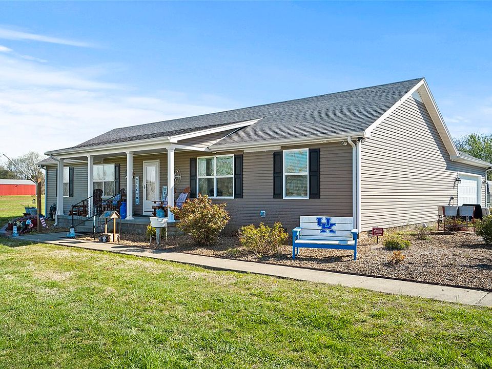 Built in 2014, this incredibly spacious, one level home is nestled within three acres convenient to I-65. Open concept, offering generous size rooms throughout. Entertaining kitchen with custom cabinetry and huge center island that flows into great room. Split floor plan, huge closets, large accommodating primary suite with separate shower, soaking tub and double vanities. This home offers a backup heat source via propane with the fireplace. 16x12 Storage Building, enclosed sunroom with hot tub, security system/cameras and Bose surround system to remain. Located on the edge of city limits with private countryside feel.