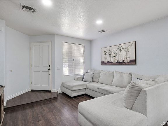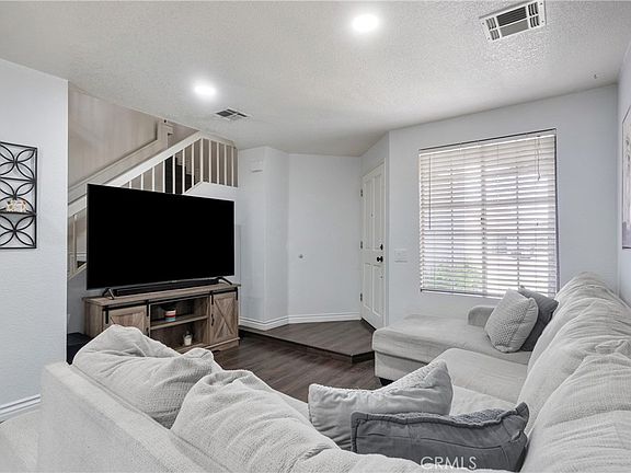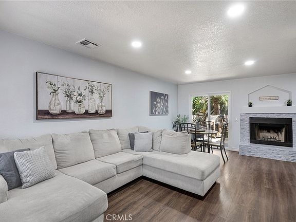 Step into the living room with an intimate dining area and dual sliding doors that frame the decorative fireplace—creating an airy flow to the outdoors. The beautifully remodeled kitchen features white cabinetry, dark granite countertops, stainless steel appliances, and recessed lighting. A convenient downstairs ½ bath for guests and indoor laundry area add to the thoughtful layout, along with direct access to the attached two-car garage. Upstairs, the spacious primary suite includes two walk-in closets and an updated bathroom with dual vanities. Start your mornings—or wind down in the evenings—on the private balcony that faces west, offering picturesque views of the mountains and either sunrise glow or sunset skies. All three bedrooms are generously sized, with updated flooring and bathrooms throughout the home. The backyard is made for entertaining, with a covered patio, lush landscaping, and a year-round producing avocado tree. Community amenities include a sparkling pool, tennis courts, and greenbelt park areas. With owned solar, a prime cul-de-sac location, and stylish updates throughout, this home combines comfort, efficiency, and charm in one perfect package.