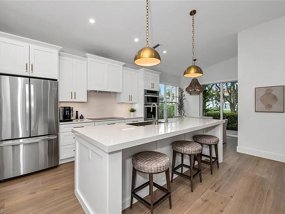 Amazing finishes in this gorgeous whole home renovation. This home has had walls moved for better flow, open great room/kitchen, privacy for guests, walk-in laundry and a large master closet. The roof was replaced in 2020. All other renovations were completed in late 2021: AC with Nest thermostat, hot water heater, whole home water softener & filtration system, flooring, hurricane windows and doors, all lighting, faux wood large plank tile flooring, kitchen appliances, washer, dryer, built-ins, solid wood interior doors throughout and hardware. The kitchen cabinets and bathroom vanities are brand-new with quartzite tops. Glass enclosed showers with all new tile and hardware. The lanai flows from the interior with the same tile with panoramic screen views of a waterway in Pelican Marsh. Designer furnishings complete this home. The exterior landscaping was replaced with new plantings and uplighting. There is room for a pool. Pelican Marsh Community Center has a fitness center, bocce, pickleball, tennis and dining. Pelican Marsh is centrally and conveniently located in North Naples.