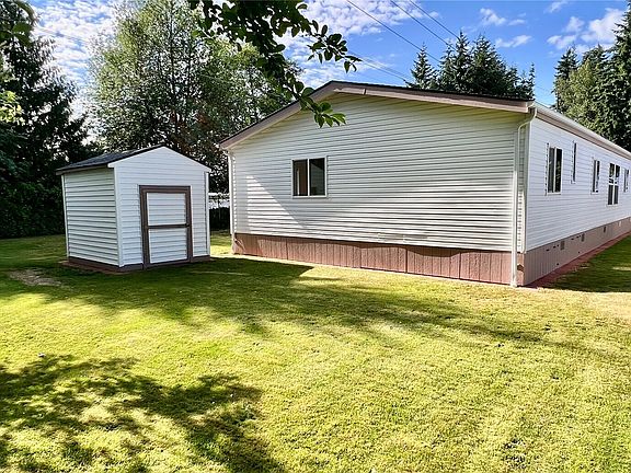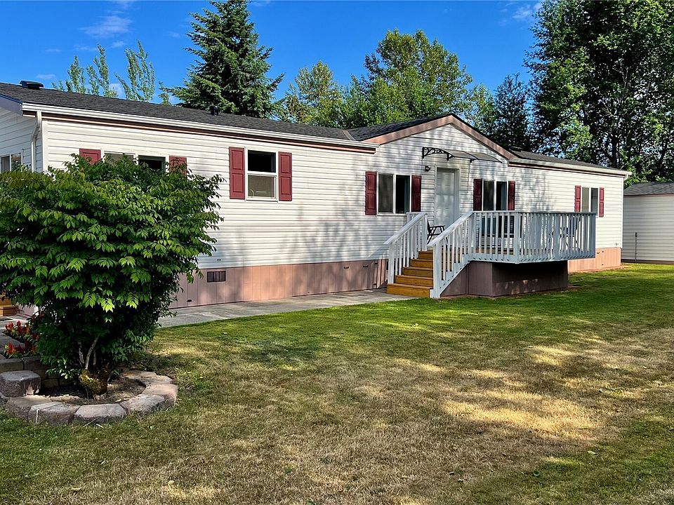 Why settle for cramped when you can stretch out in this meticulously maintained 5-bed, 3-bath gem at the end of a cul-de-sac? Set on a private lot in a well-kept park with affordable $895/mo space rent, this 1,728 sq ft home features vaulted ceilings, a spacious kitchen with stainless appliances, and a cozy sit-down nook. The primary suite fits a king bed with room to spare and boasts a large ensuite with a soaker tub and full-size shower. The bedrooms are generously sized and all offer walk-in closets. Recent upgrades include a new roof, 8 new windows, sleek Pergo flooring and more. Outside, enjoy a private deck and an 8x10 powered shed for your tools or toys. Five-bedroom homes like this are rare—act fast!