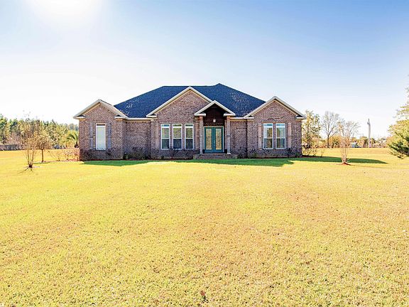 Custom Built Estate Home situated on 4.73 acres 2 miles east of Baldwin Beach Express and 20 minutes north of beautiful Gulf Coast Beaches. Solid built home with 4/4.5 baths, formal living area, bonus/flex space off Master bedroom suite. Heated/Cooled 3 car garage with bonus room above perfect for teen suite/hobby space. Wood floors, built in desk, closet and loft area. Main floor is tiled throughout for low maintenance upkeep, Granite counters, attractive custom touches/trim. Expansive kitchen with gas stove, large undermount sink, island with prep sink. Beautiful custom wood-stained cabinets and decorative back splash. No wasted space with this floorplan. Master bedroom suite is overlooking bonus space and back patio. Bathroom has large double vanities, bubbling tub, oversized custom tiled shower. Walk in closet has shelving, cubbies, and tons of storage. Spare bedrooms have individual bathrooms for privacy. Living area has gas log F/P, wet bar with sink and hop-up bar. Back patio is covered with outdoor kitchen, bead board ceiling, decorative fenced area and hot tub. Separate 34x40 metal barn with (4) 10' roll up doors. Water, power and plumbed for easy bathroom addition. Shop has built in work benches, (2) 50 amp hook-ups, separate meter. Acreage has full irrigation, separate 3.5 inch well. RV's and horses welcome! New Fortified Roof.