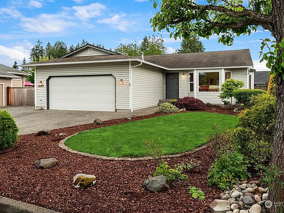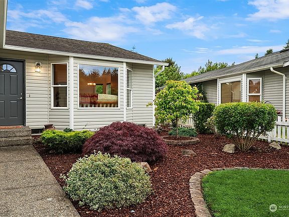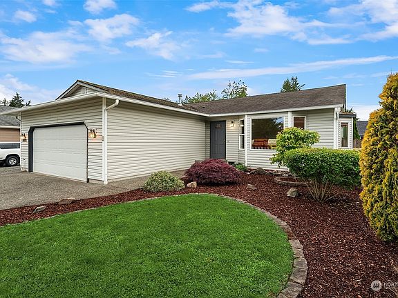 NEW PRICE in Desirable High Clover Park! Enjoy one level living, an open concept kitchen, bar & dining area all under sun filled sky lights & vaulted ceilings. Two living spaces with a welcoming gas fireplace in the family room & a drenched in natural light bay window in the living room. Generous sized bedrooms, primary with ensuite, soaking tub & walk in closet. New flooring, lighting & paint throughout! Fully fenced private yard with a covered deck, R.V. Parking, additional shed, low maintenance landscaping & garden beds just in time for planting! R.V. parking + more with gated access & an attached garage equipped with a work bench. Greenbelt areas for long dog walks & a great location minutes to I-5, downtown, airport, amazon & more!