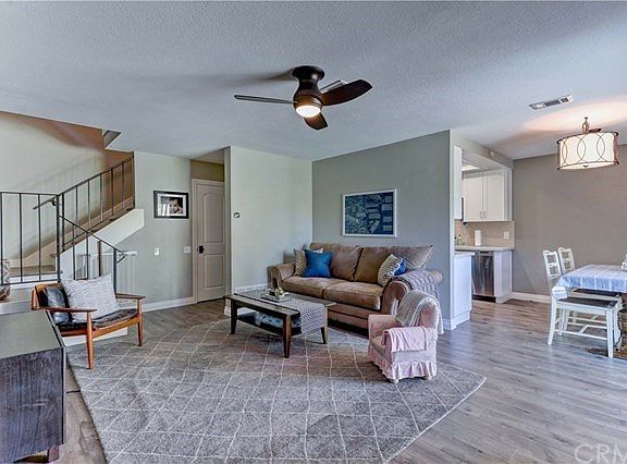 Truly turnkey & beautiful townhome. Professional design includes remodeled kitchen w/white shaker cabinets, quartz countertops, SS appliances, porcelain glazed subway tile backsplash. DS bath has white wainscoting, grey porcelain tile & white vanity. Upstairs bath has grey slate flooring, updated vanity, lighting & water saving Kohler toilet. All cabinets t/o updated to white shaker style. Master bedroom accommodates your largest furniture. Both bedrooms have floor to ceiling closets w b/I organizers for maximum storage. Bronze Ceiling fans in living area & both bedrooms; dual pane, vinyl windows & slider; ceilings have been scrapped, laminate flooring t/o. 4-3/4 baseboards, interior shaker style doors w/bronze knobs, shaker style front door w/bronze hardware. A separate laundry room w/additional storage, newer AC/furnace & wifi enabled Nest thermostat complete the package. Patio off the kitchen/dining room overlooks large, private grassy area w/city lights view. 2 pools, spas, playground and racquetball and volleyball court in the community. HOA includes basic Spectrum cable, trash pickup, exterior maintenance, painting, roofs, landscaping and more. Yorba Regional park is down the road with biking and hiking trails, picnic, playground areas and water features. Fairmont Hill is freeway convenient to the 91, 55 and toll road in addition to shopping, restaurants and entertainment. The community is located in the award winning Yorba Linda School District and is