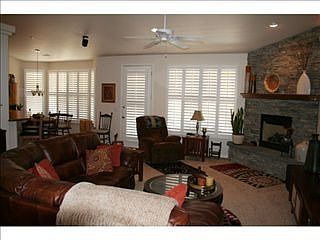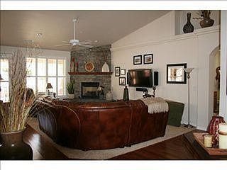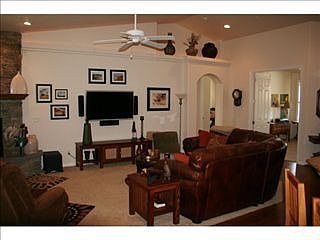 Excellent open floor plan with great rm, split bdrms, high ceilings, fireplace with stone accents and more. 4 bdrm or 3 bdrm and office. Custom cabinetry, granite countertops. Spacious master bdrm with door to private patio. Large front and back covered patios. This home is situated back on a large 3/4 acre lot, on a quiet cul-de-sac, with extensive landscaping and greenbelt on two sides. Very private. Easy driveway. Complete with heated garage, dogrun, workshop, and plantation shutters.