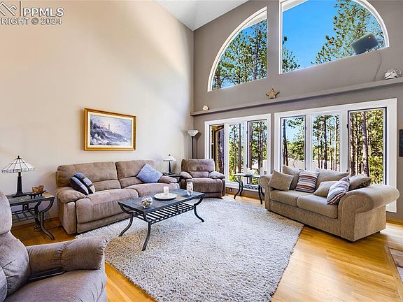 Desirable Woodmoor /Top O The Moor 2-Story Home on a lush 1 acre lot! Immaculately maintained, gleaming wood floors and picturesque windows galore! 4 Bedrooms + a Den/Office and 5 bathrooms. As you enter this home, you are immediately greeted with stunning views from all windows, beautiful wood and tile floors, and tall ceilings that make this home feel very spacious. Neutral decor and paint tones, all the charm in the world. Main level boasts a Great room with high ceilings, tons of of windows a dual sided gas fireplace (can be wood burning if converted), Formal Dining room with stunning wood floors, tray ceilings and crown molding, a Game room/Bonus room with direct back patio access, a open Kitchen with a large island, plenty of cabinets and storage, eat-in Kitchen area, a Laundry washer and dryer (counter and cabinet space), a formal Mud room off the garage, a bonus Sunroom space, also a main level Office/Den with 1/2 guest bath for that added convenience. A main level Owners retreat, sizable room, skylights, ensuite 5-piece bath, large soaking jetted tub, dual closets and double sink counters, a stand alone shower, such a serene and calm place to relax. Upper level features 3 bedrooms, 2 of the upper bedrooms have private balcony access and the 3rd bedroom has an attached 3/4 bathroom, perfect for extended family/friend space. The lot and curb appeal are so inviting, back yard Patio has a hot tub that is included, 2 crank style awnings, new concrete patio, wooded lush tree lot, such beautiful views. Roof, gutters/guards/downspouts are 2 years old, 2 new furnace's less than 3 years old. Home has a partial home humidifier. Ring doorbell and 2 Ring Floodlight cameras can be included. The oversized 6 car garage, 220 Volt, has light, heat and a workshop area. Roof deicing cable installed. Gazebo and lawn swing are also included. The beauty of this home & lot would make any one feel right at home, a place of tranquility and peace.