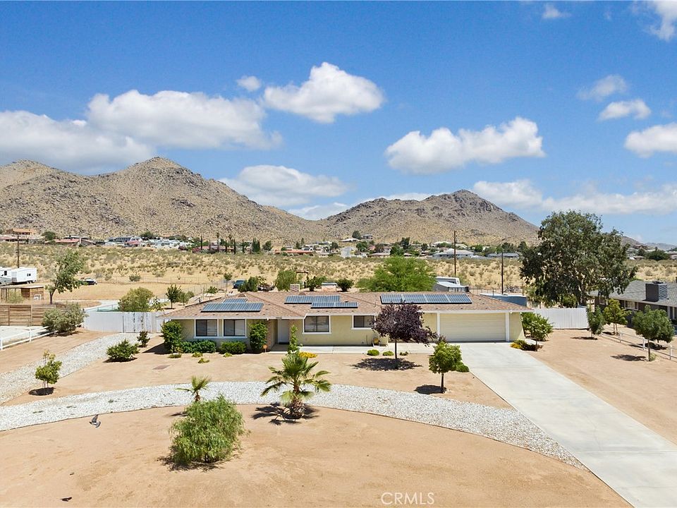 A stunning 4-bedroom, 2-bathroom residence nestled in the foothills of Apple Valley. This property boasts recent upgrades, including fresh interior paint and newly installed recessed lighting throughout. The kitchen and bathrooms feature elegant granite countertops and modern showers. All appliances are included with the home. Exterior enhancements consist of fresh paint on the fascia and fencing, a newly roofed back patio, newer water heater, and a drip system catering to all plants and trees. The garage cabinets are part of the sale. Noteworthy additions comprise an upgraded breaker providing 220V to the backyard, along with water access, ideal for an accessory dwelling unit (ADU) or RV parking. The property features pull-through RV parking, a meticulously maintained flat yard, and many mature trees! Also includes leased solar panels along with a battery system. Don't miss out on this golden property!